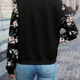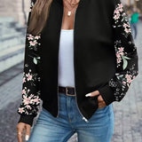 floral print zip up jacket elegant long sleeve baseball collar jacket for   womens clothing black 2